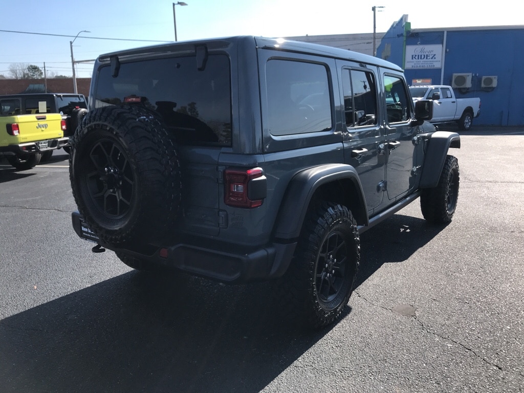 Convenience Group: Emergency/Assistance Call; 2-Door Passive Entry. Front Door Locks; Remote Start System; Cluster 7.0 TFT Color Display; Universal Garage Door Opener; Heated Front Seats; Air Conditioning W/Auto Temp Control; Heated Steering Wheel; Air Filtering. Safety Group: Auto High Beam Headlamp Control; Blind Spot & Cross Path Detection; LED Taillamps; ParkSense Rear Park Assist System; Injection Molded Black Rear Bumper. Quick Order Package 24W Willys: 7 & 4 Pin Wiring Harness; Conventional Differential Front Axle; 4-Wheel Drive Swing Gate Decal; Black Grille; MOPAR All-Weather Floor Mats; Injection Molded Black Rear Bumper; Dana M210 Wide HD Tube Front Axle; Daytime Running Lamps LED Accents; Front LED Fog Lamps; LED Premium Reflector Headlamps; E-Locker Rear Axle; Corning Gorilla Glass; Security Alarm; 4.10 Rear Axle Ratio; 5. 675 lbs GVWR; Class II Receiver Hitch; Mold In Color Bumper W/Gloss Black; Advanced Brake Assist; Willy's Suspension; LT285/70R17C BSW Mud Terrain Tires; Automatic Headlamps; Deep Tint Sunscreen Windows; Off-Road Plus Mode; 17 X 7.5 Painted Black Wheels; Willys Hood Decal; Full Speed Forward Collision Warning Plus; Rock Protection Sill Rails; Power Heated Mirrors; Enhanced Adaptive Cruise Control; Auxiliary Switches; Dana M220 Wide Rear Axle; Molded in Color Rubicon Highline Flare; Premium Wrapped Steering Wheel; Sun Visors W/Illuminated Vanity Mirrors. Trailer Tow & Aux Switch Group: Class II Receiver Hitch; 7 & 4 Pin Wiring Harness; Auxiliary Switches. Quick Order Package 23W Willys. Sky 1-Touch Power Top. Black MOPAR Perforated Leather. Anvil Clearcoat. **Equipment listed is based on original vehicle build and subject to change. Please confirm the accuracy of the included equipment by calling the dealer prior to purchase.**